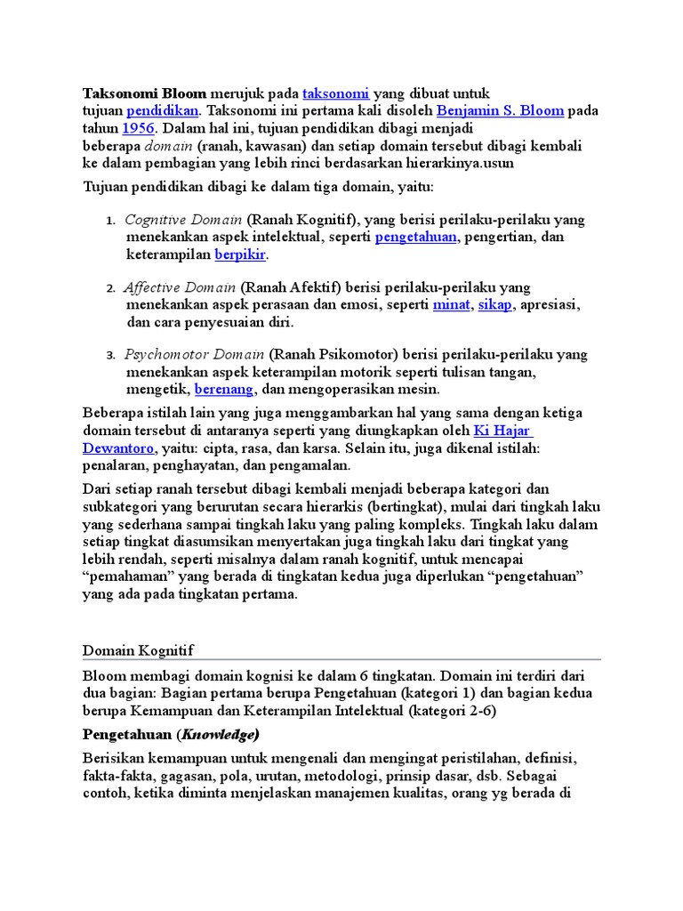 Ranah kognitif ranah afektif dan ranah psikomotor dimana setiap ranah dibagi lagi lebih rinci menjadi beberapa bagian. Secara bahasa Taksonomi sendiri berasal dari kata tassein dan nomos. Pengetahuan Knowledge Tujuan - mengingat semula semua perkataan tanpa berlaku sebarang perubahan.